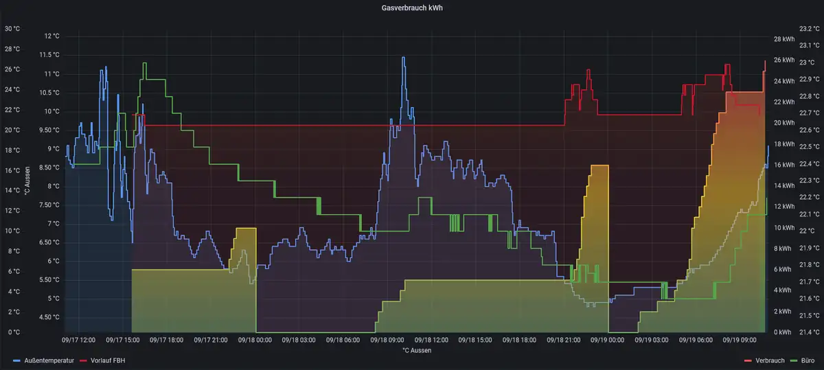 Der ganz große Vorteil von Home Assistant ist aber, dass ich alle Parameter der Heizung, Raum- und Außentemperaturen über lange Zeiträume aufzeichnen und vergleichen kann. Damit hat man die optimale Grundlage für Optimierungen und kann wirklich beurteilen, ob diese etwas gebracht haben.