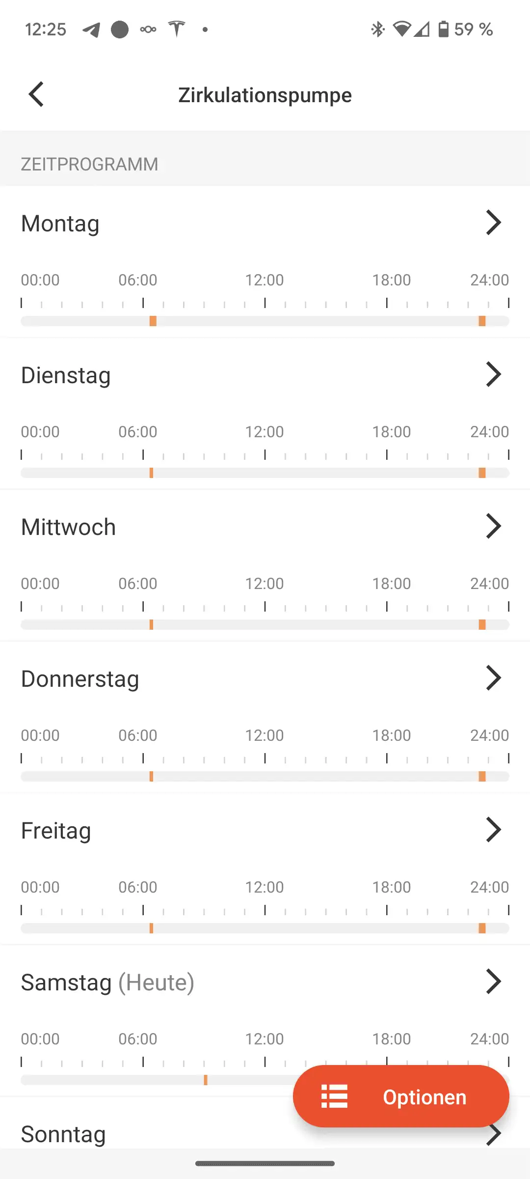 Wir haben nur noch 48 °C Warmwassersolltemperatur und eine einzige Aufheizung um 6 Uhr morgens. Die Zirkulation springt um 6:30 Uhr und um 22:30 für jeweils eine halbe Stunde an – das war es! Damit haben wir 24 Stunden lang ausreichend warmes Wasser, selbst für eine Dusche am Abend.