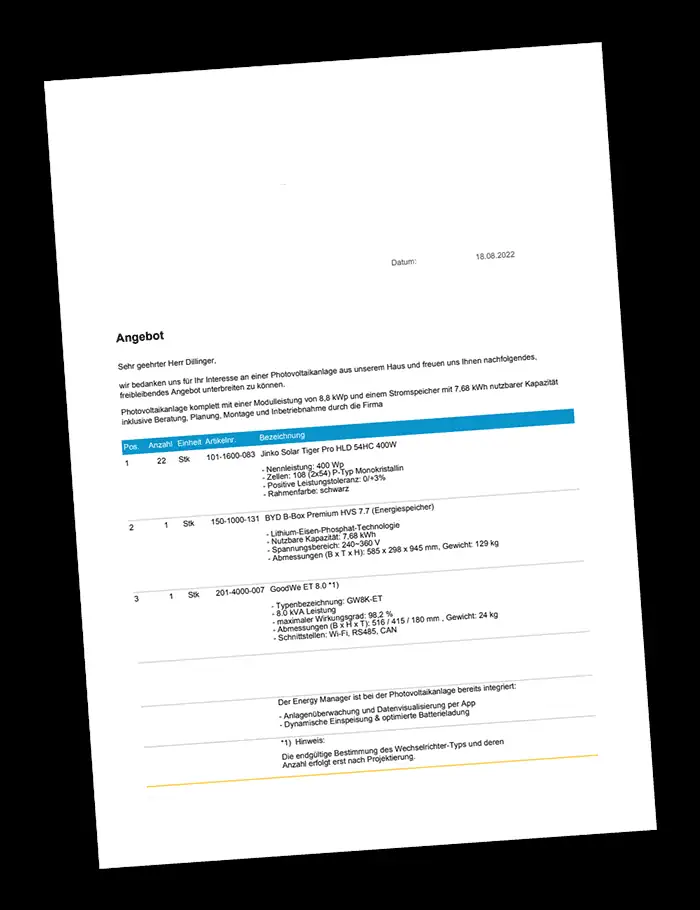 Ein großer Anbieter aus Bayern, der das Bundesland auch im Namen trägt und viel Werbung in sozialen Medien macht, bekam auch eine Chance. Der Termin vor Ort kam schnell zustande und der Vertriebsmitarbeiter war sehr sympathisch. Er arbeitete wohl als freier Handelsvertreter und eine Recherche bei LinkedIn etc. ergab, dass er eigentlich branchenfremd ist. Das machte sich auch im Gespräch bemerkbar, da es kaum belastbares Wissen gab. Die zukünftigen PV-Erträge waren sehr optimistisch berechnet und das Angebot wurde vor Ort erzeugt.