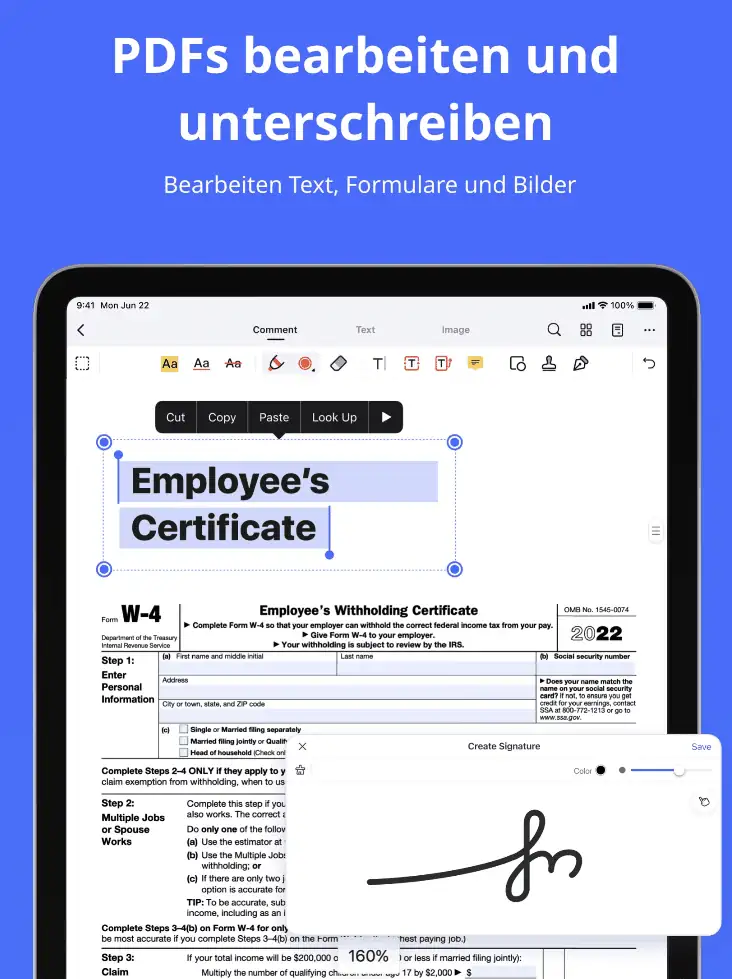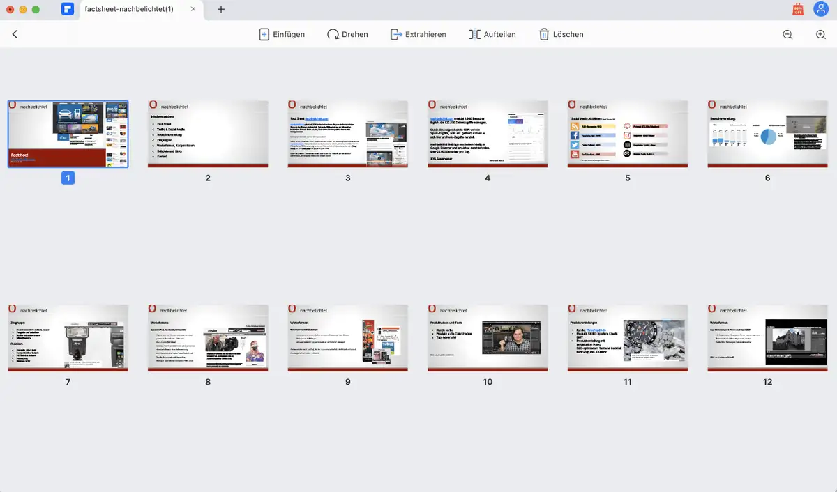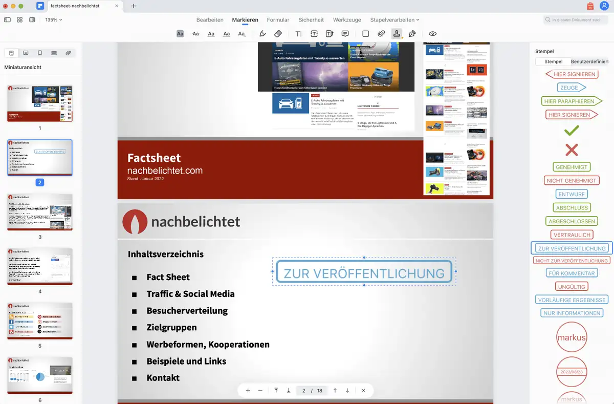 PDF-Dokumente können in aufgeteilt, Seiten neu angeordnet oder ersetzt werden. Mit den Bearbeitungsfunktionen lassen sich Anmerkungen, Wasserzeichen, Stempeln oder Signaturen einfügen, wobei PDFelement auch gleichzeitig ein leistungsfähiger PDF-Reader ist.