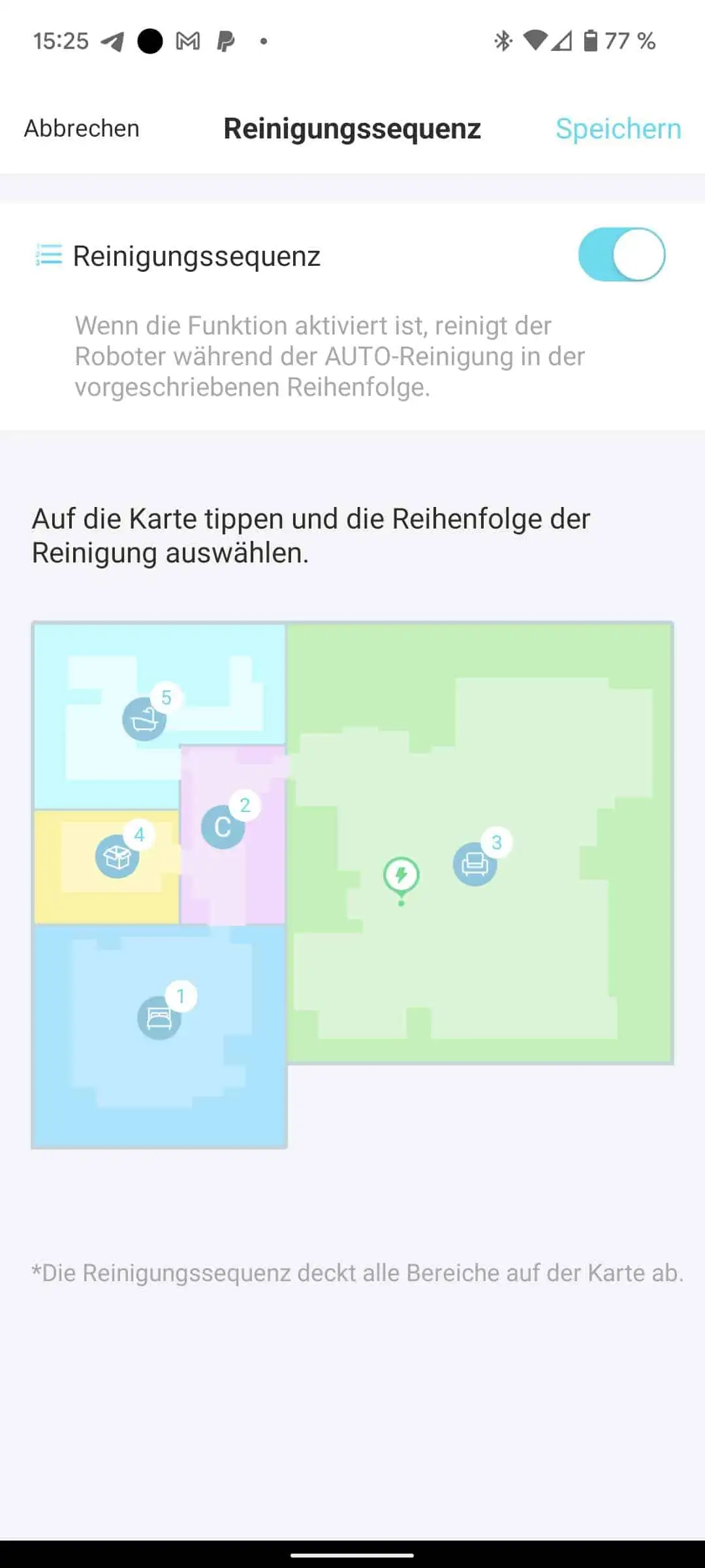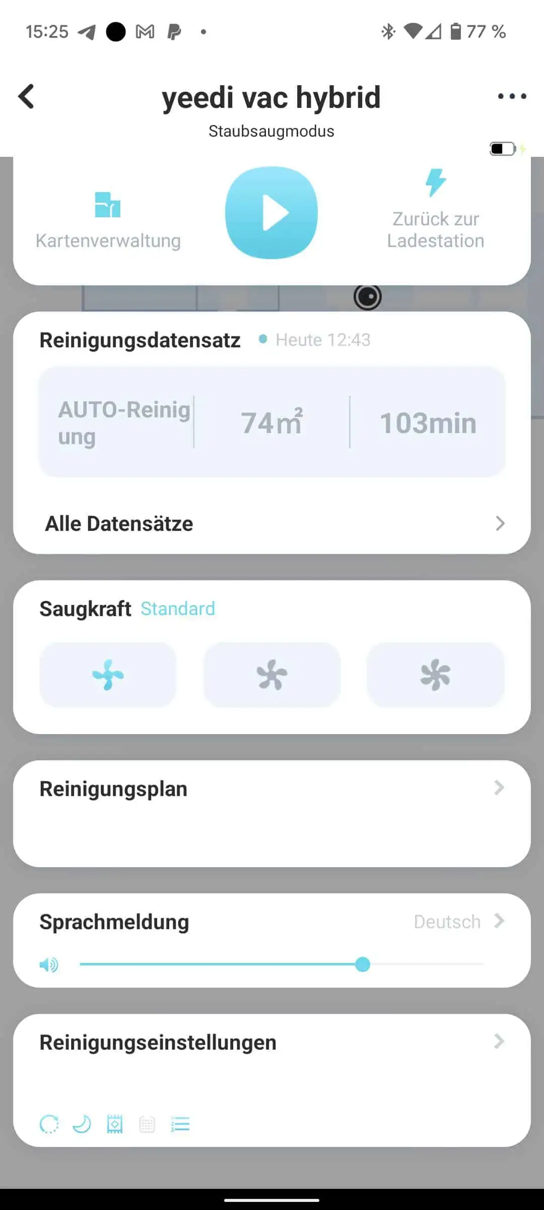 In der App können dann Zeitpläne und auch die Reihenfolge der Reinigung festgelegt werden. Man findet Statistiken zur Reinigung, Einstellung der Saugkraft usw. Für Teppichböden kann eine automatische Erhöhung der Saugkraft aktiviert werden.