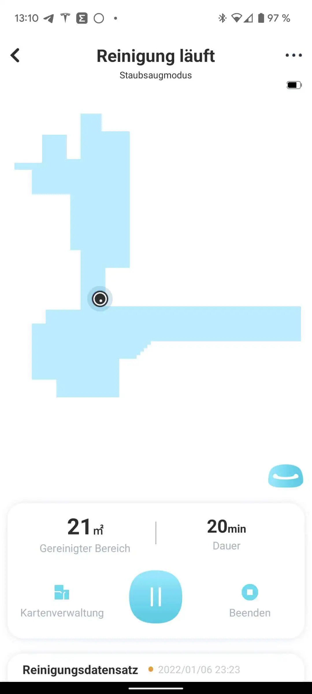 Wenn es während der ersten Kartenerstellung Probleme, wie z. B. Festfahren gibt (wir hatten das zwischen zwei Barhockern in der Küche), bricht er die Kartenerstellung ab und man muss sie danach neu starten.