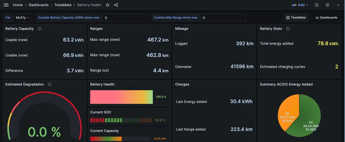 Teslamate, which runs on my home server, comes to a similar conclusion. Again, there is hardly any evidence of range loss.