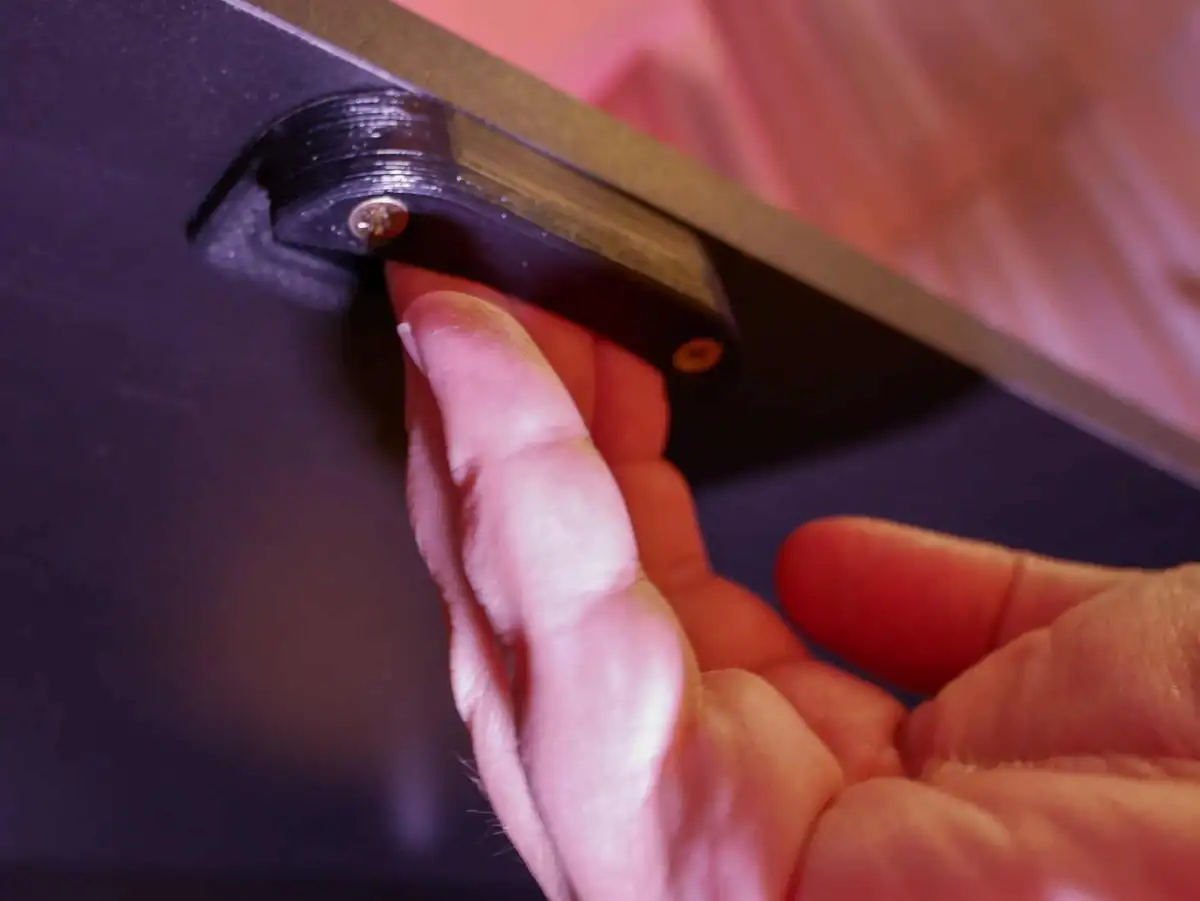 However, I have also made a small modification here: If you want to pull out the drawer, you have to grip the plate. Depending on the weight of the devices on the pull-out, this can be a little more strenuous, which is due to the sturdy construction. I therefore designed and 3D-printed two handles, which I screwed to the underside of the pull-out.