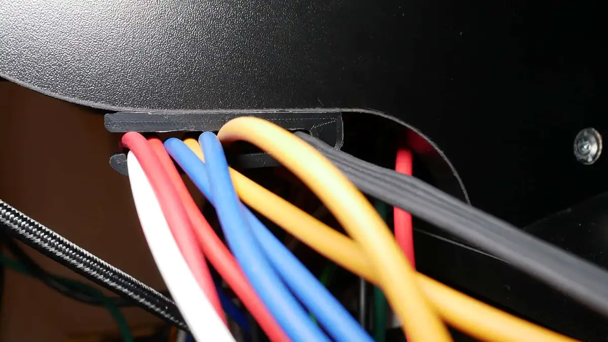 There are permanently attached Velcro strips on the back through which the cables can be routed. They can also be used to secure a socket strip. However, it is advisable to fit screw-on socket strips here. I also designed cable guides and made them with the 3D printer. These allow me to run signal and power cables separately from each other and help to keep things organised.